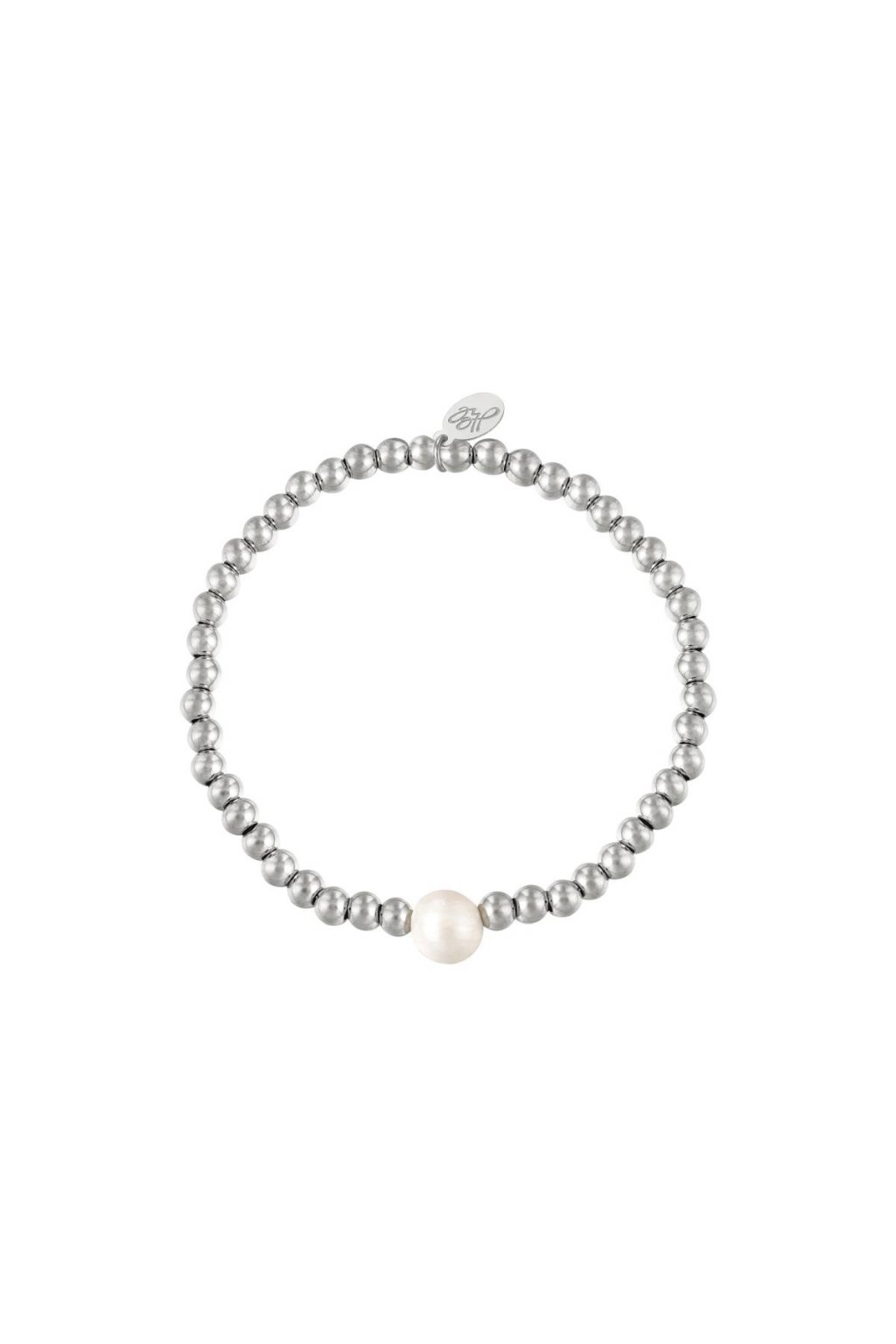 Náramok z chirurgickej ocele. Jemný korálkový náramok zdobí veľká biela sladkovodná perla. Vďaka pružnej gumičke sa náramok prispôsobí každej veľkosti.