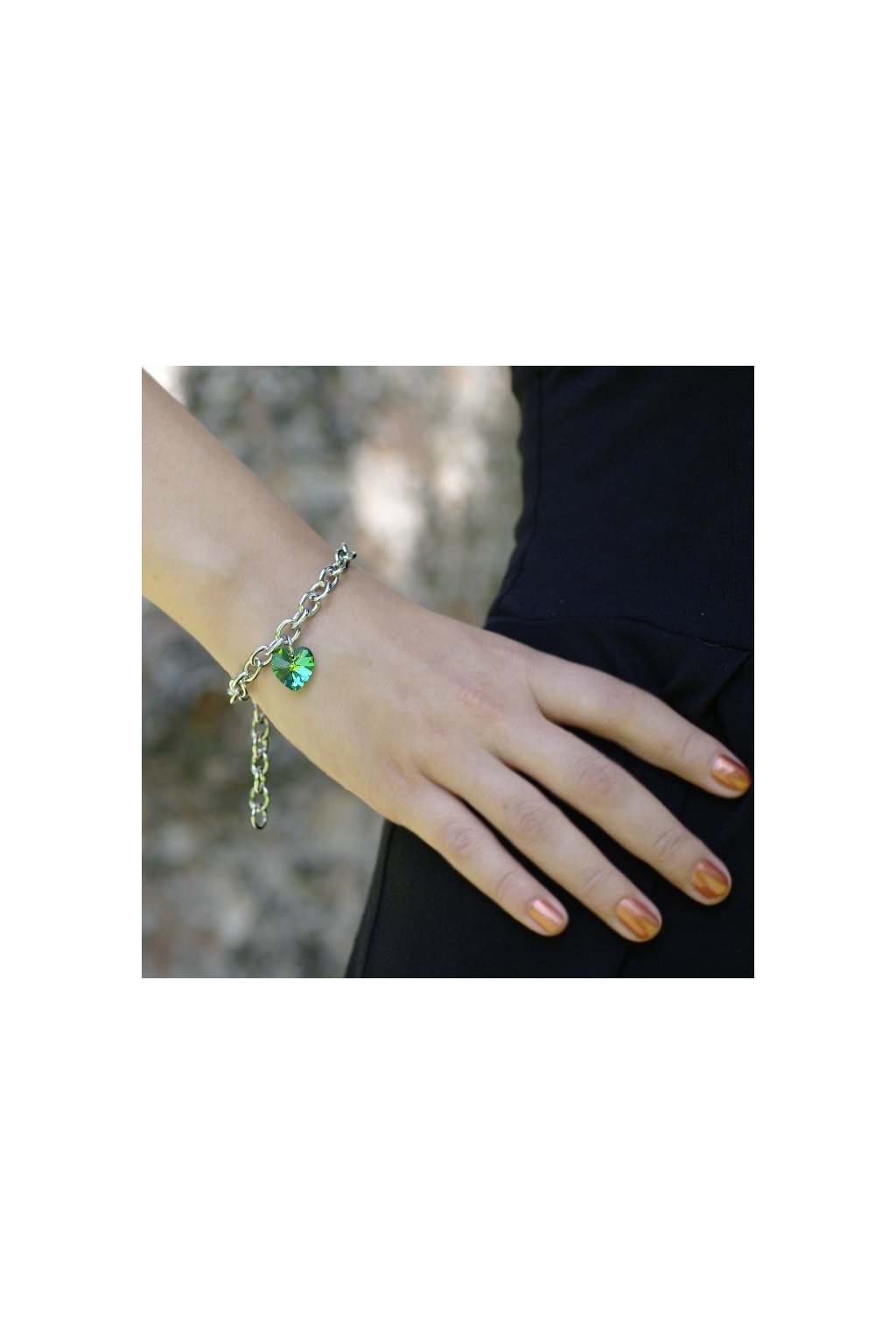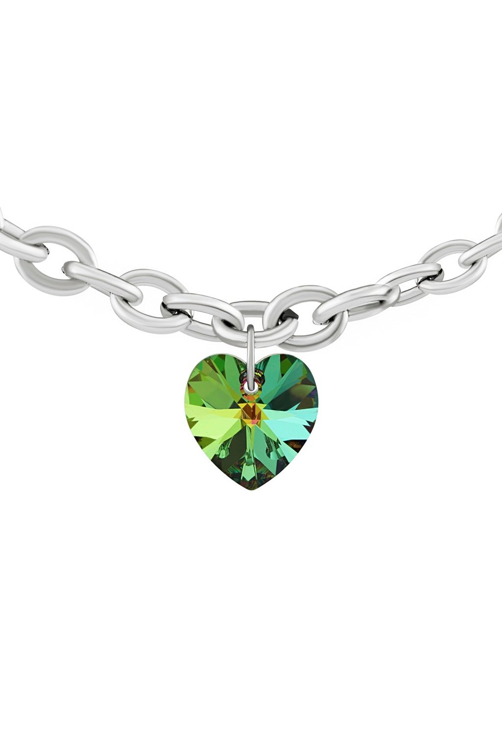 Tento obľúbený náramok je tvorený oceľovou retiazkou so šírkou 7,5 mm a krištáľom Swarovski. Zeleno-modrý krištáľ Swarovski je vybrúsený do tvaru srdca 14mm.