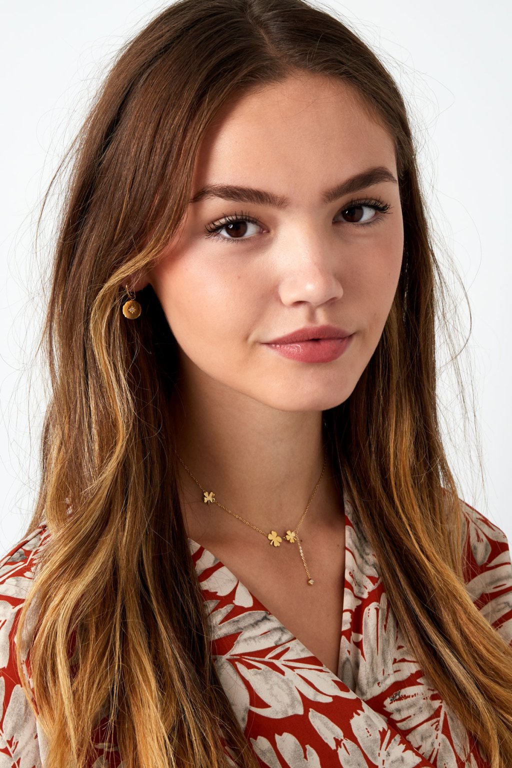 Pozlátený náhrdelník z chirurgickej ocele. Minimalistickú retiazku zdobia tri štvorlístky v zlatej farbe. Retiazku dopĺňa zirkón.
