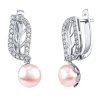 Zaujímavé náušnice dekorované pravou prírodnú perlou s jemným nádychom ružovej farby. Perla je zavesená na striebornej ozdobe s motívom lístku, ktorý je lemovaný čírymi kamienkami krištáľu.