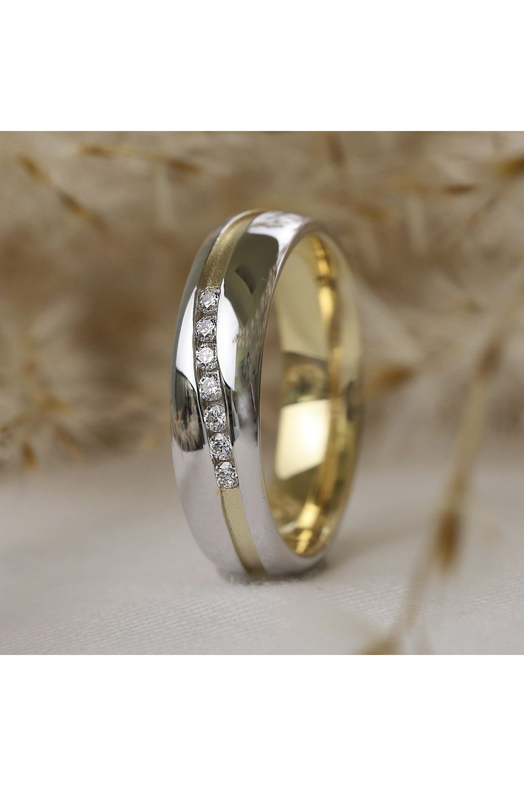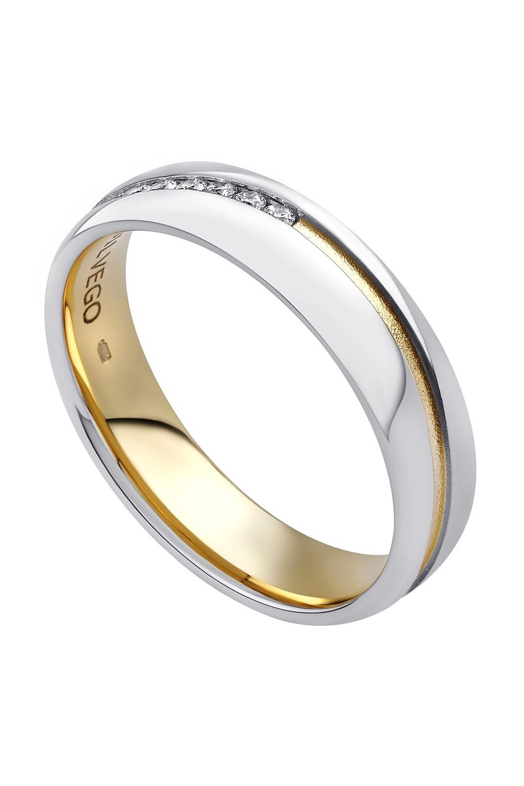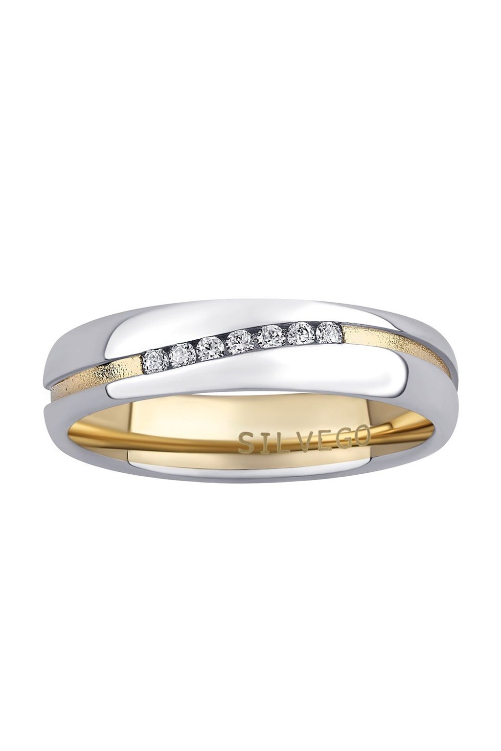 Snubné prstene MARIAGE sú z časti pozlátené žltým zlatom. Prstene zdobí pozlátená vlniaca linka, dámska obrúčka obsahuje sedem čírych zirkónov v strede prsteňa.