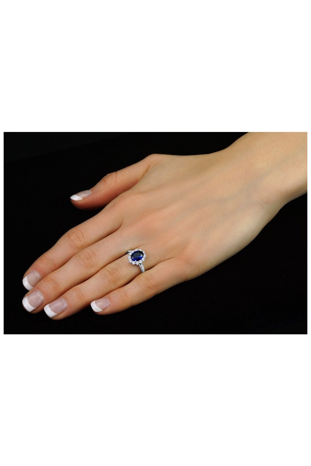 Nami ponúkaný prsteň je osadený drobnými zirkónmi a uprostred krásnym tmavo modrým syntetickým zafírom oválneho tvaru s rozmerom 6 x 8 mm. Tento krásny luxusný strieborný prsteň bude určite vaším neprehliadnuteľným doplnkom.