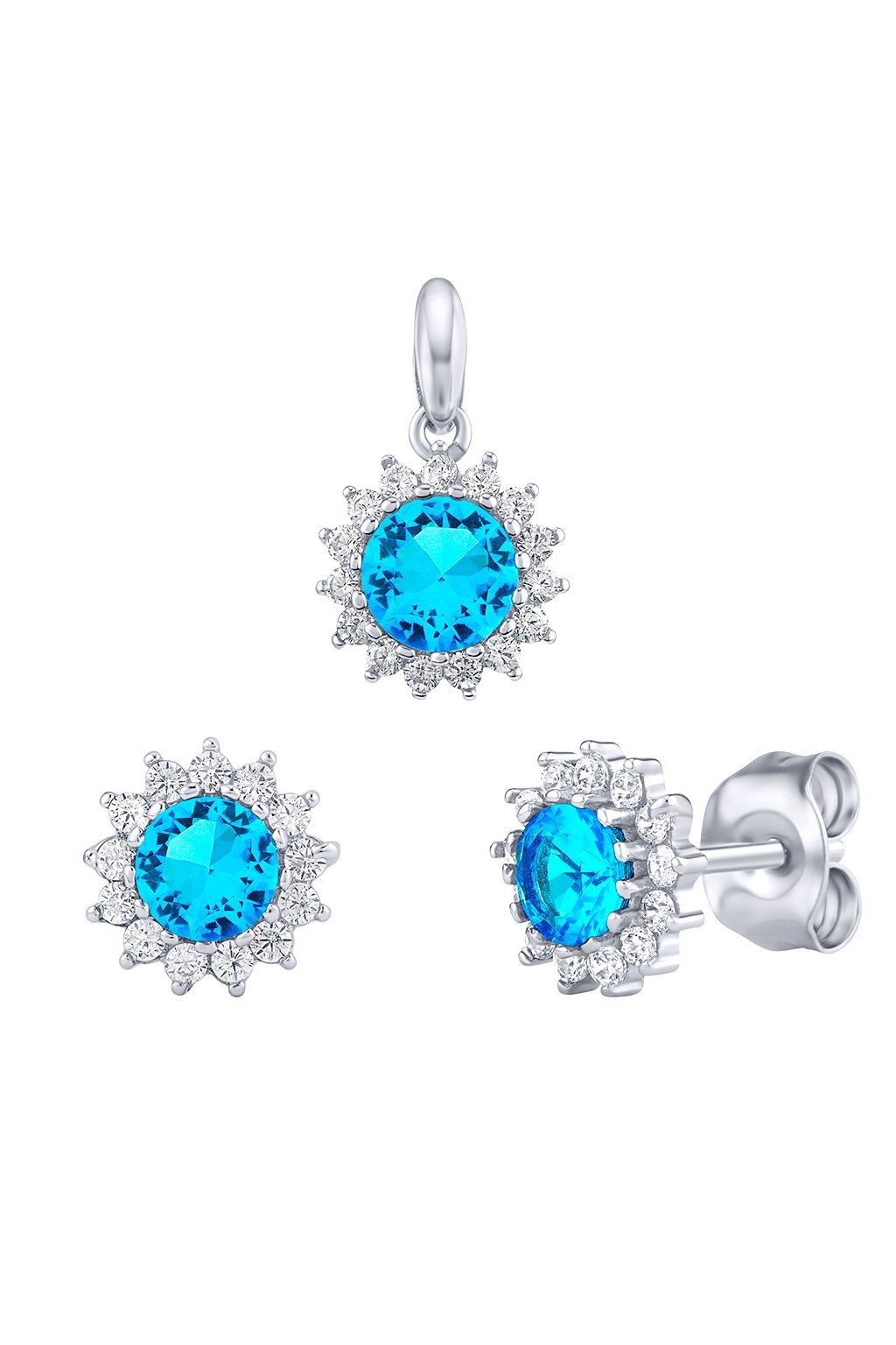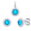 Strieborná súprava šperkov je decentne skrášlená drobnými čírymi kamienkami a stredovým tyrkysovým zirkónom, ktorý má okrúhly briliantový výbrus.