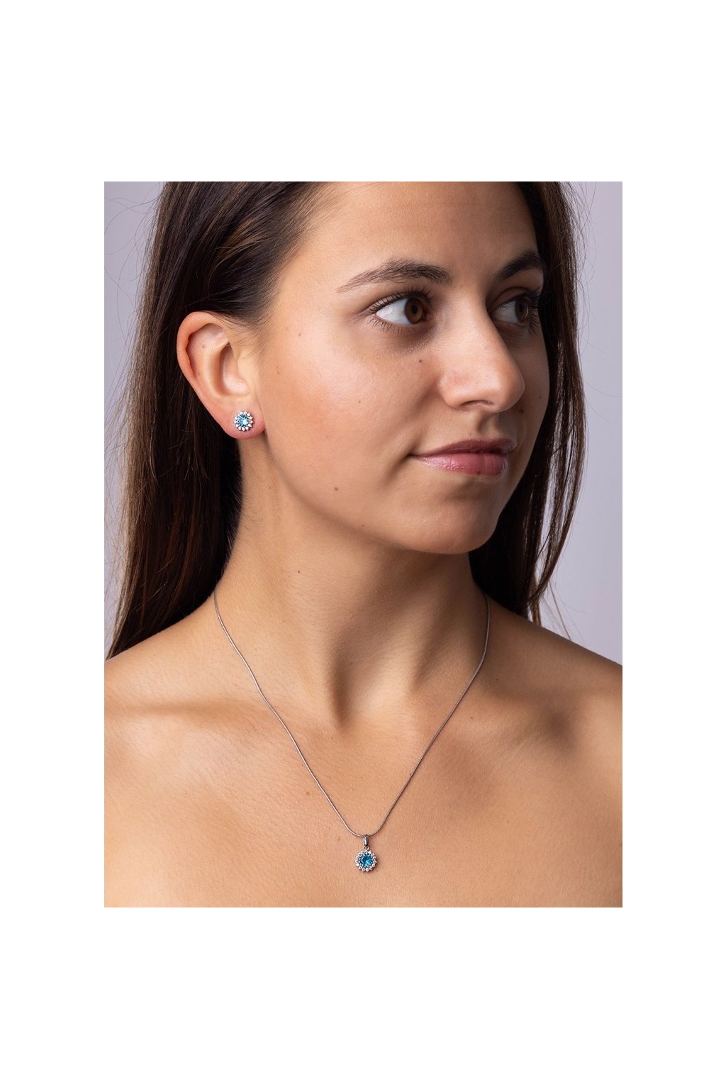 Strieborná súprava šperkov je decentne skrášlená drobnými čírymi kamienkami a stredovým tyrkysovým zirkónom, ktorý má okrúhly briliantový výbrus.