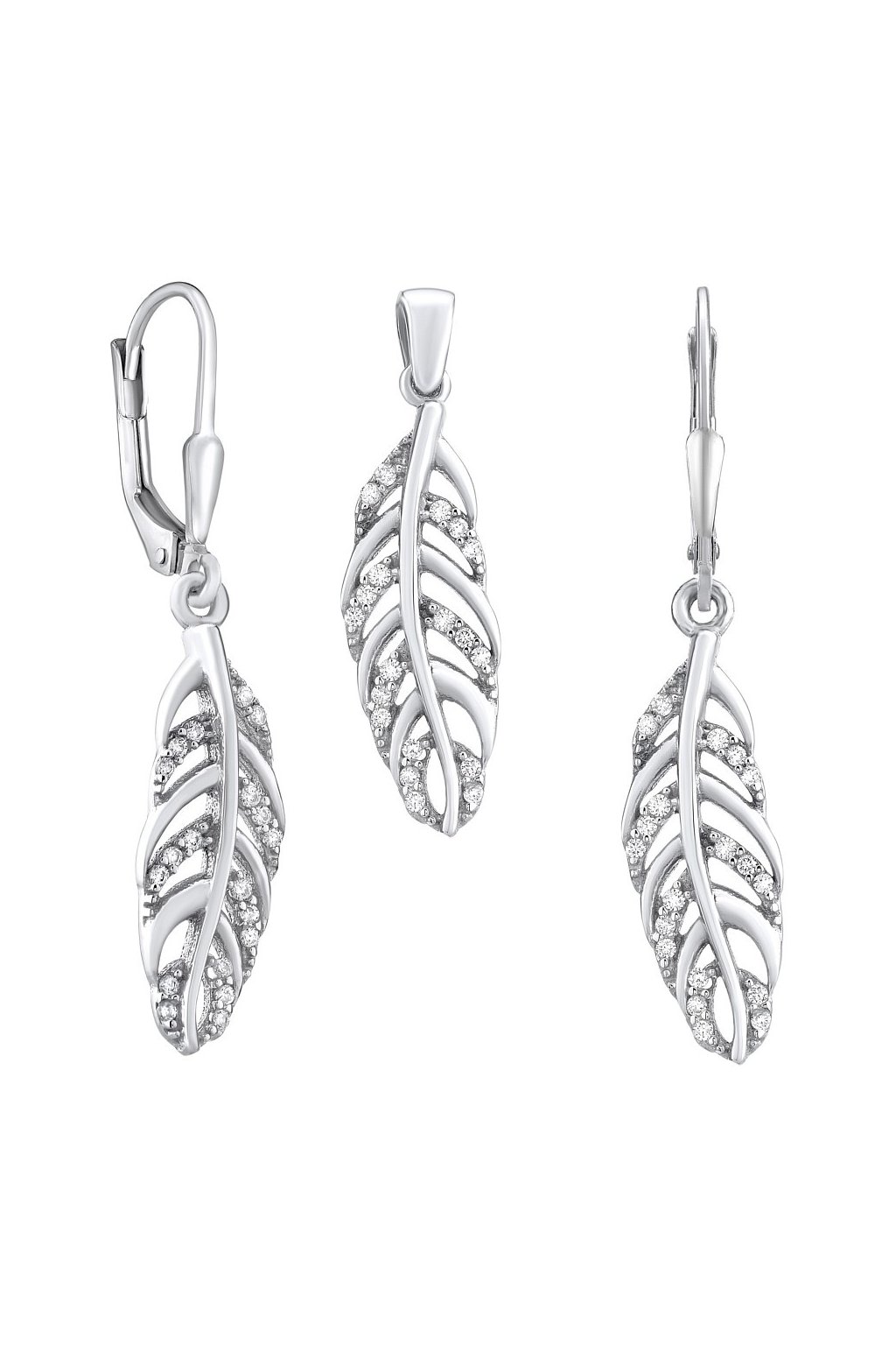 Strieborná súprava šperkov v tvare pierka - náušnice a prívesok so zirkónmi.
